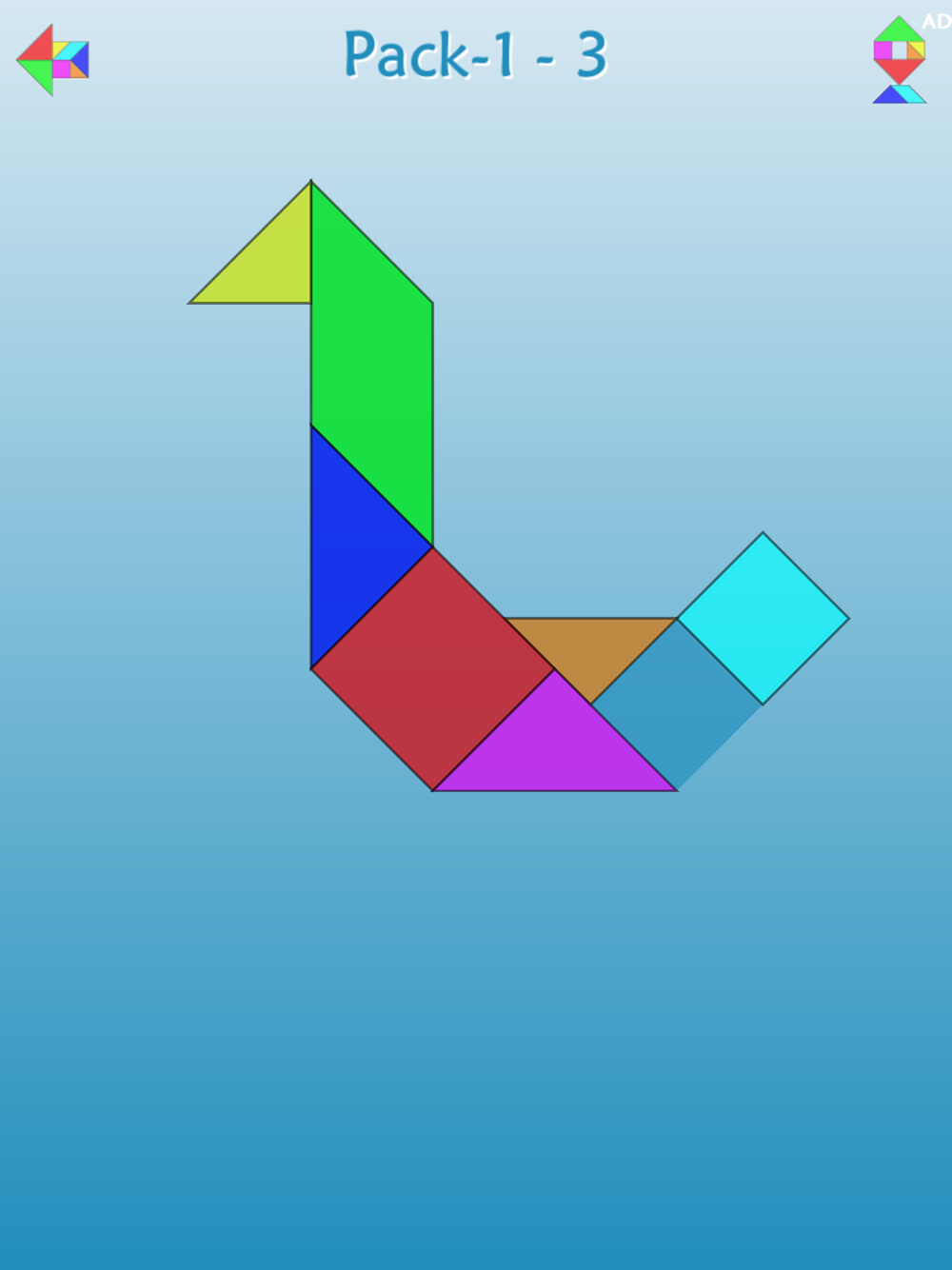 This game contains nine types of Tangram puzzle. Games and levels are constantly added. Tangram puzzles include the Chinese classic Tangram and 15 pieces puzzle(Yi Zhi Tu), as well as T puzzle, Heart-shaped puzzle, Pythagoras, Sphinx and Modern Tangram(Lou Zhuqiu). There are three kind of play methods. Not just move. You can play classic game(Move, Flip & Rotate) or for relaxing(Just Move).