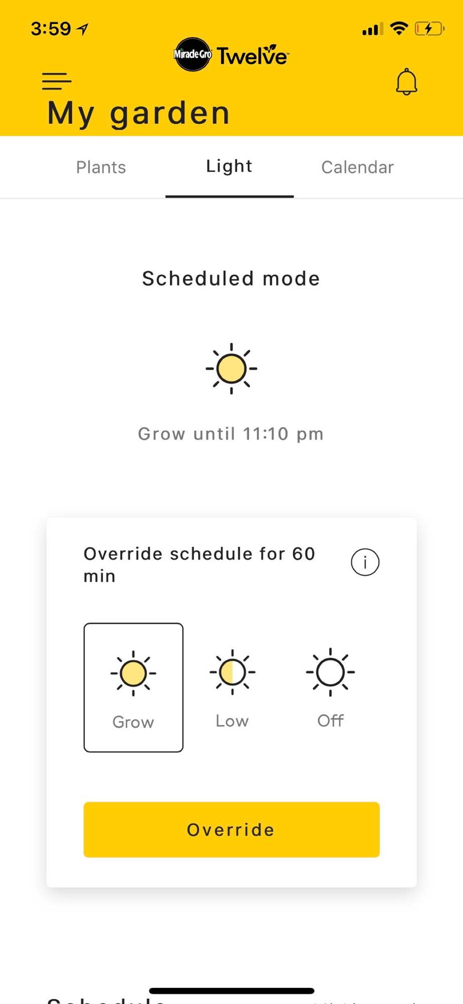 The Miracle-Gro Twelve Indoor Growing System comes with a 60W, cool-spectrum LED grow light with three different levels of light. Grow, a bright light for growing plants. Low, a dim light, not for growing. Off, no light. Easily change the mode of your light through the Miracle-Gro Twelve App to override your normal grow schedule. When you override your grow schedule, a timer will start so your normal schedule resumes automatically after 60 minutes.
