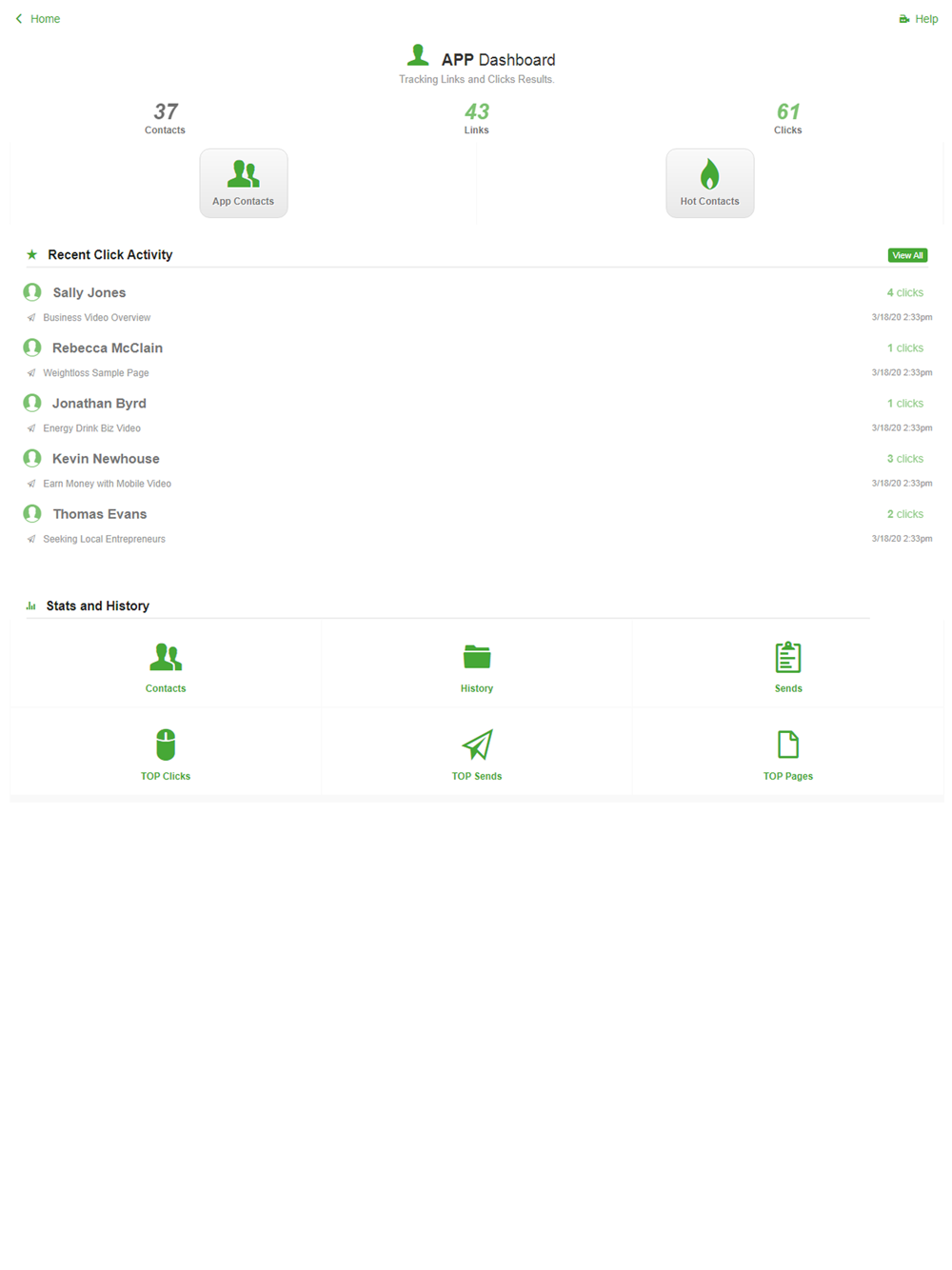 Choose a Contact from your "Phone Contacts" and easily push a trackable link, with a pre-written message (or your own messages) to a specific page or specific video. Get Alerted when they click the link and more. Easily create the pages you need in your marketing system backoffice