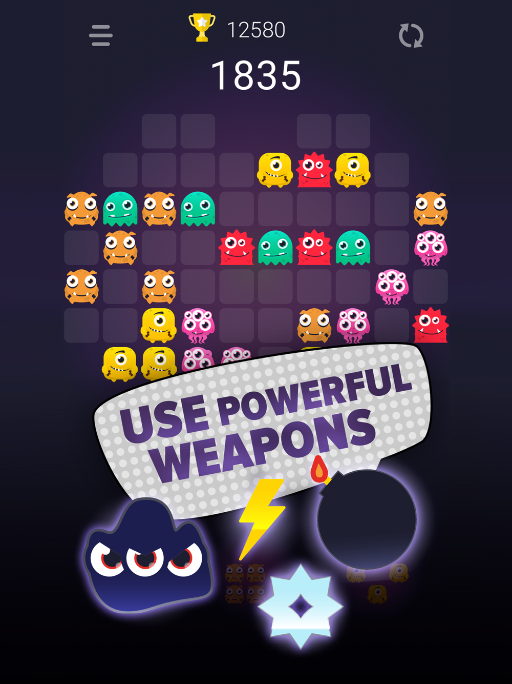 Move the blocks formed from the monsters and fill the cells on the game board. Keep in mind that the blocks cannot be rotated, and the blocks installed on the board cannot be moved. The game will end when the board runs out of space for installing new pieces of monsters. Your task is to score as many points as possible! The weapons will help you, use them to destroy more monsters.