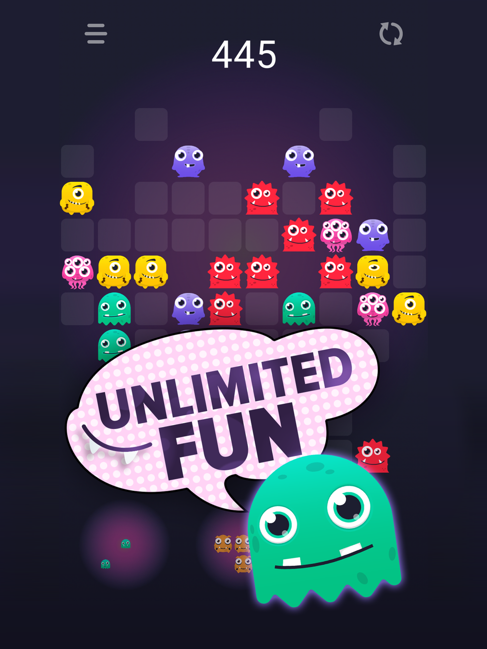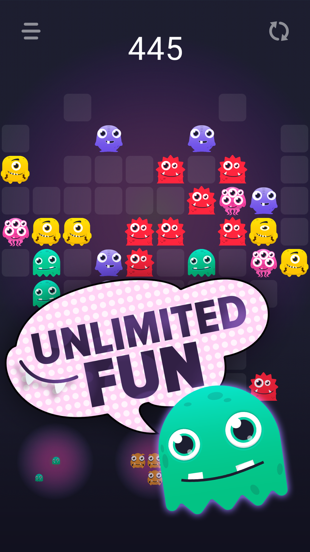 It is necessary to collect in a row monsters of the same color, in this mode, three or more monsters collected in a row are destroyed.