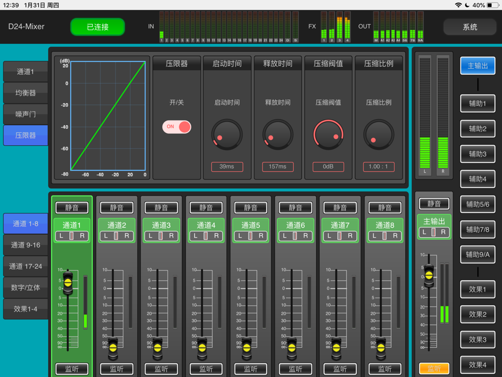 输出处理:高低通滤波,15段参数均衡,压缩器,延时,相位