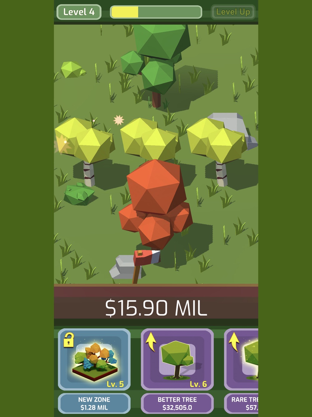 Discover new kinds of trees, cut them down and earn a big profit in the land of Timberlandia, idle clicker game where trees regrow in seconds.