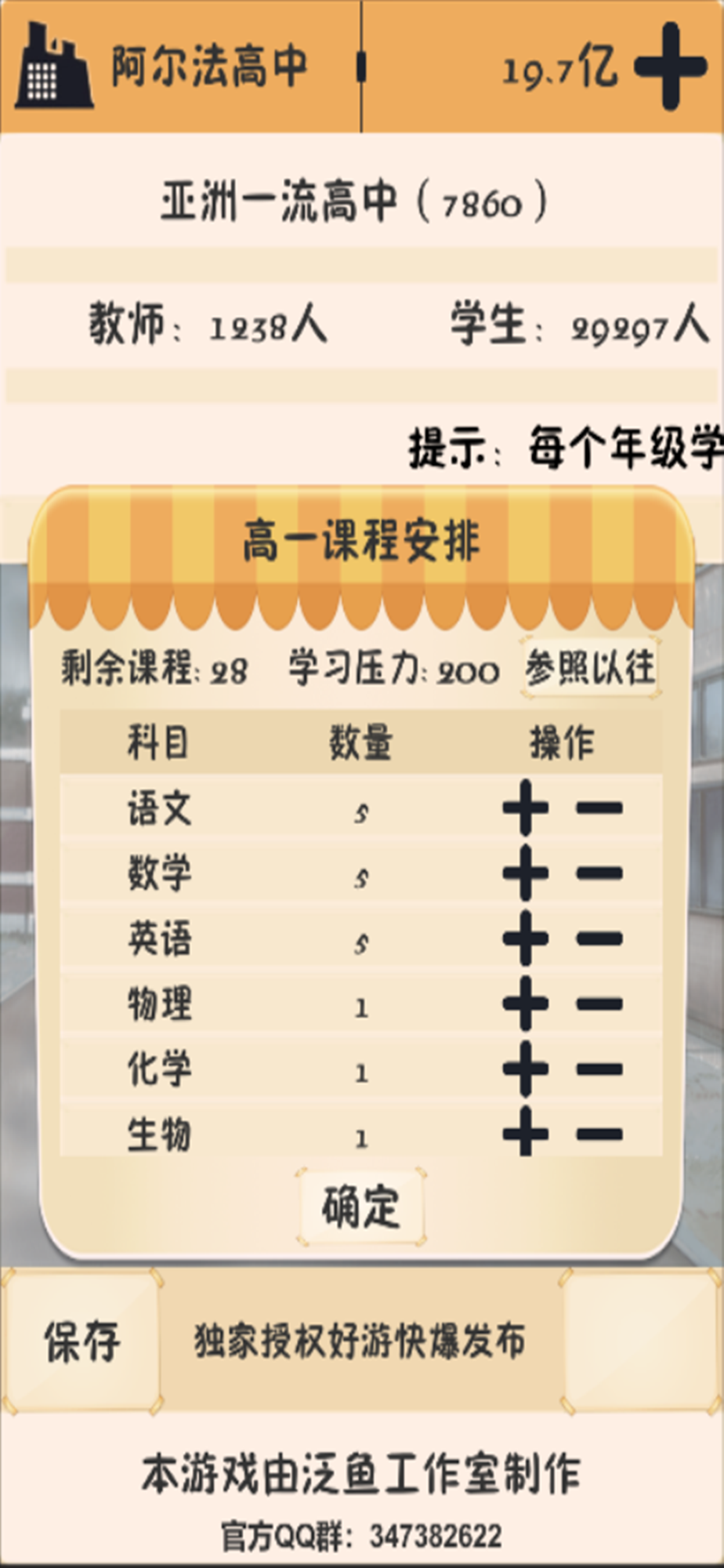 模拟学校经营,你来当校长,怎么排课,放不放假,都由你说了算,经营过程中遇到的各种突发事件该如何处理,每年的高考该如何准备,这都将是你的考验,你的目标就是将你的学校发展成世界一流名校。