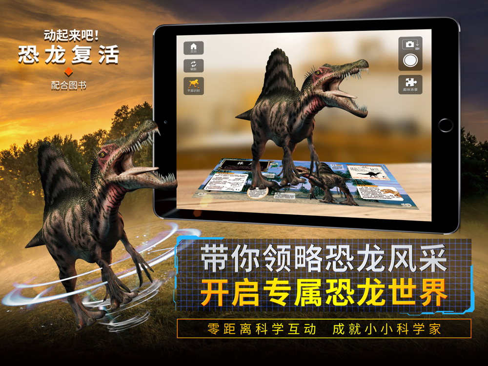 此APP搭配《动起来吧!恐龙复活》科普图书,通过移动设备摄像头识别书里的不同页面,从而在纸面上出现真实的3D模型: 你就可以控制身躯庞大的恐龙在桌面上行走,给恐龙喂食,跟恐龙合影,甚至变成考古人员,敲击开恐龙化石探究恐龙骨骼,同时还有更多趣味互动等你体验!