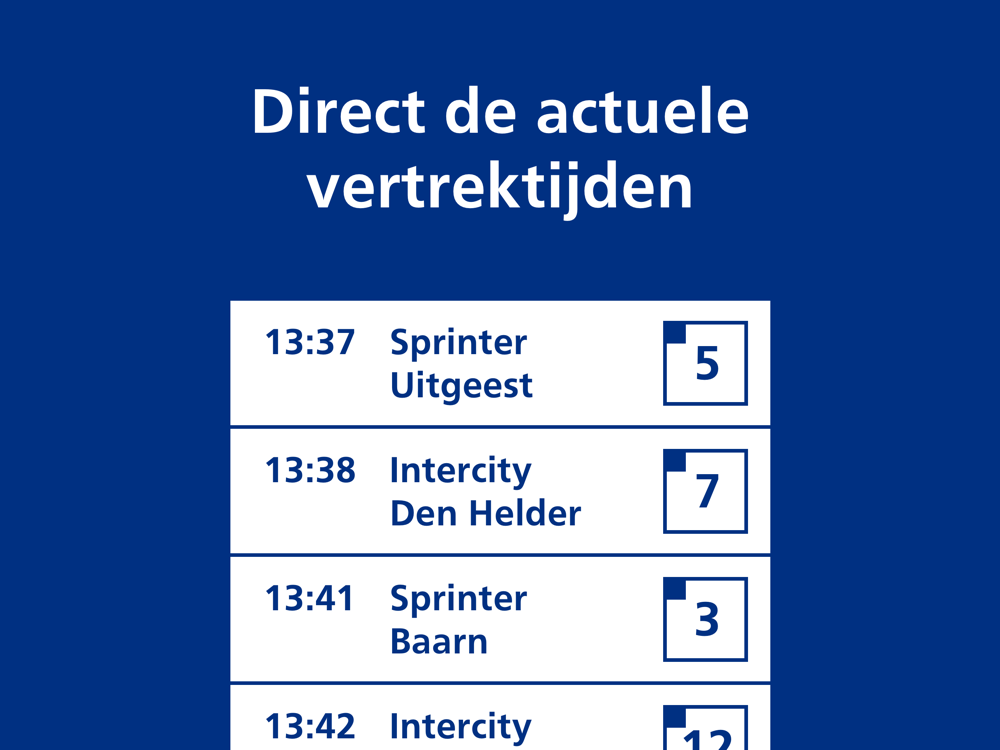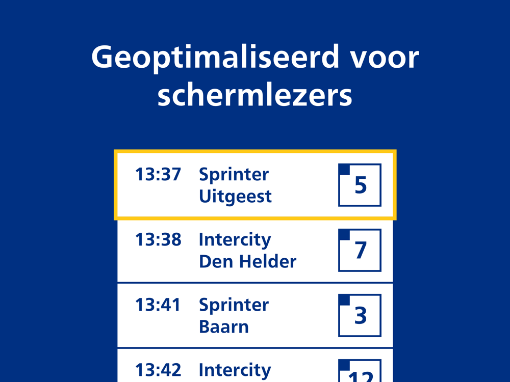 In de NS Perronwijzer vind je de informatie over de eerstvolgende trein die vertrekt op het perron waar jij je bevindt. Zo kun je een laatste check doen of je in de juiste trein stapt als je de informatie op de borden boven de perrons niet of lastig kunt lezen. Heb je spraak geactiveerd op je telefoon? Dan leest de app ook voor wat er op de borden boven de perrons staat. Dat werkt heel eenvoudig: al met een paar kliks hoor je de belangrijkste reisinformatie van het perron waar jij je bevindt.