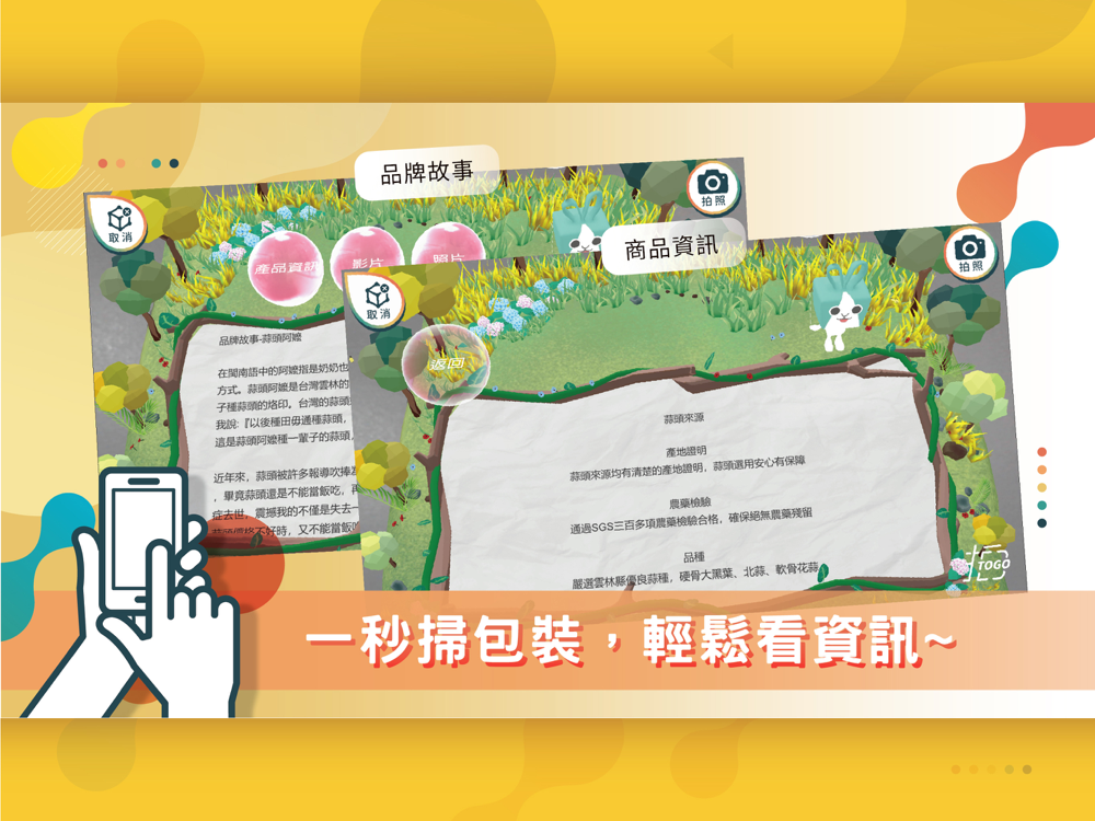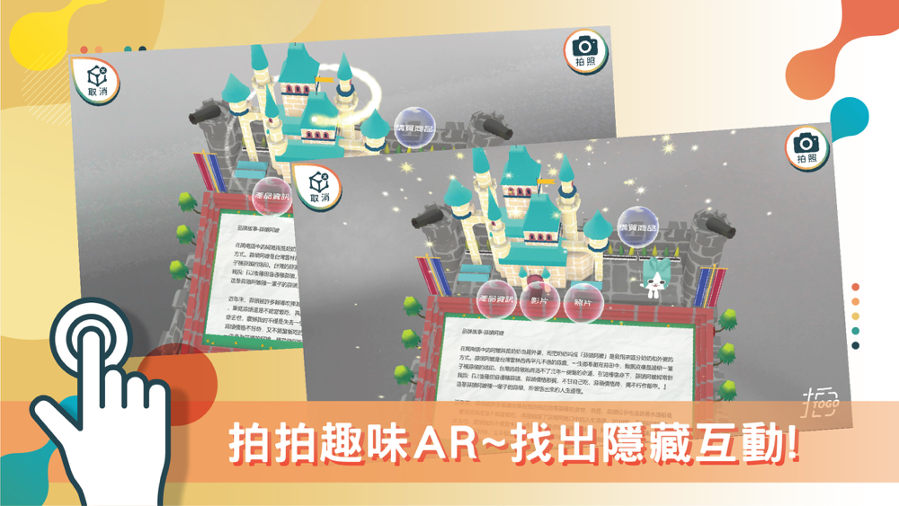電商平台結合拍TO GO APP,使用者可透過AR來了解產品的相關資訊(如文字介紹、影片、照片等),搭配精心設計製作的平台吉祥物「拍兔」及不同主題的3D模版,在瀏覽資訊的同時也可以有小互動。