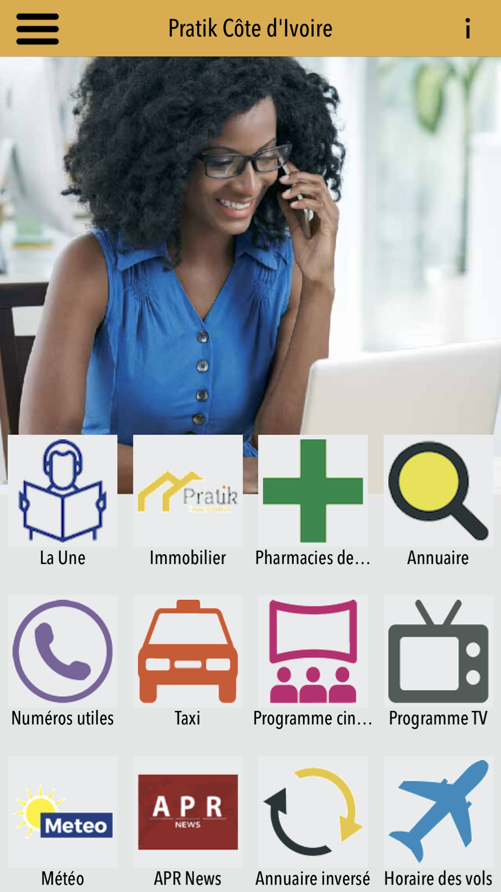PRATIK rassemble également des contenus significatifs issus d’internet qui couvrent les secteurs de l’immobilier, de l’actualité avec les "UNE" de la presse nationale, de la santé et des loisirs avec les programmes TV ou cinéma, ainsi que les horaires d’avion et les bonnes adresses et les bon plan a Abidajn et dans les reste de la cote d'ivoire.