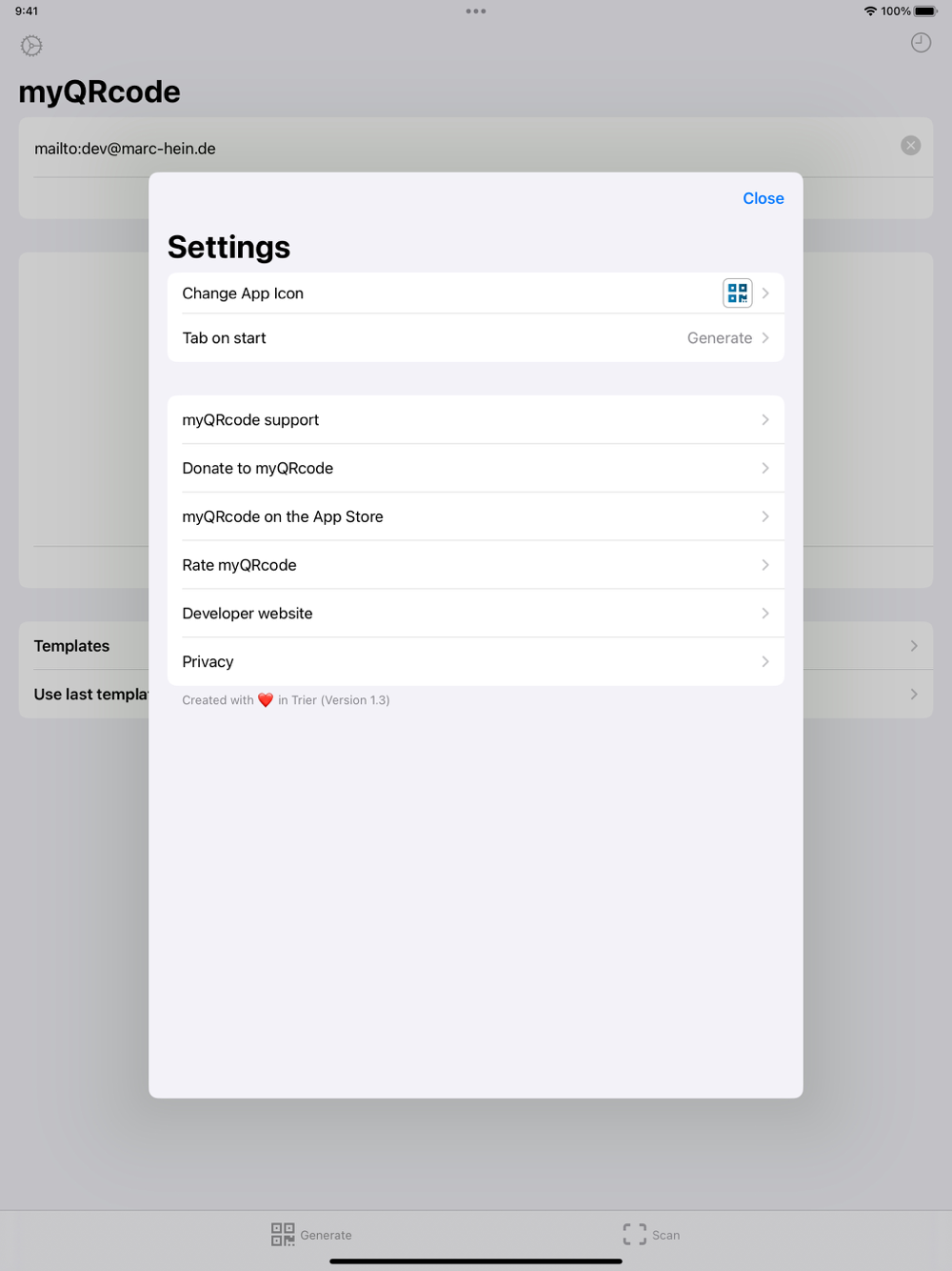 If you like myQRcode, I would be very happy about a tip! You can do this in the app under Settings > "Donate to myQRcode“.