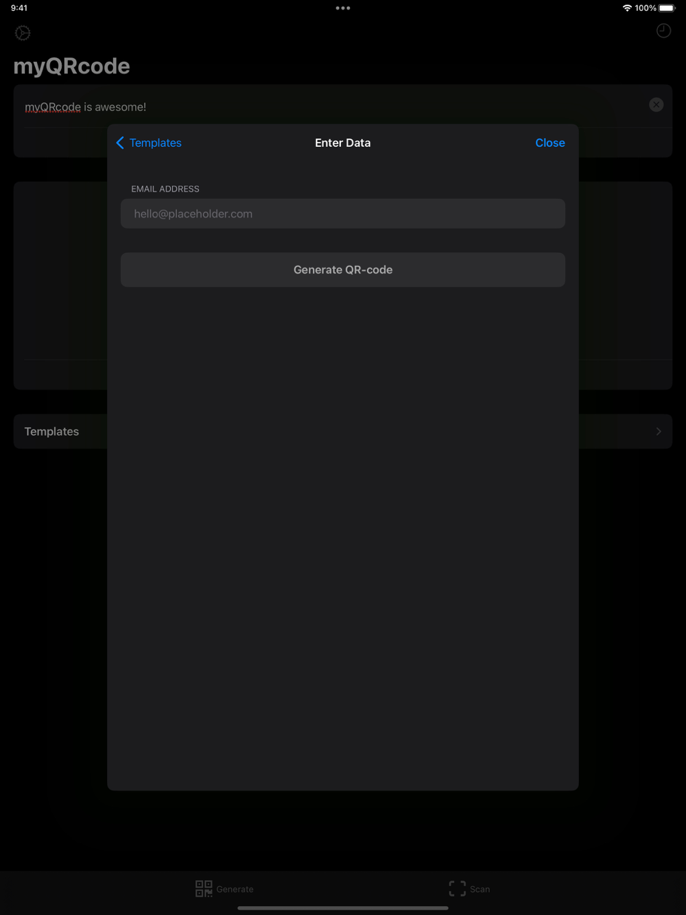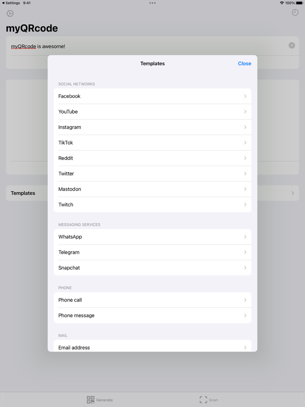 - Create QR-Codes from different templates (e.g. save WLAN access data as QR Code)
