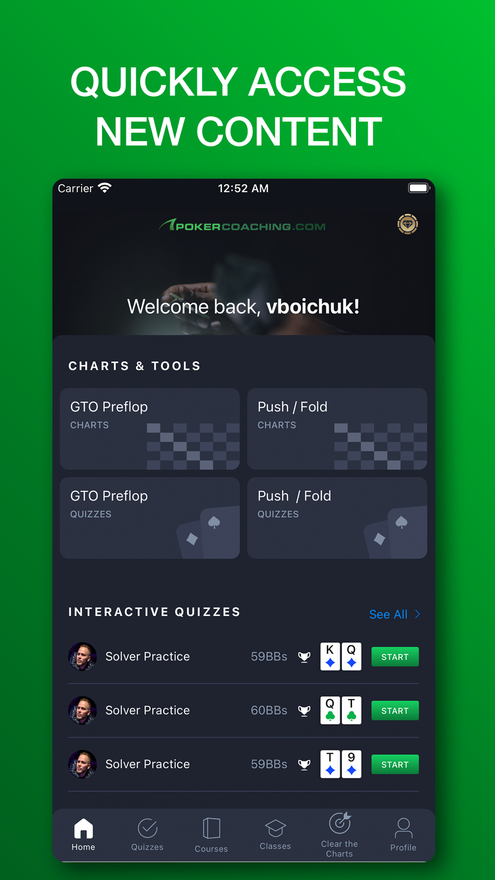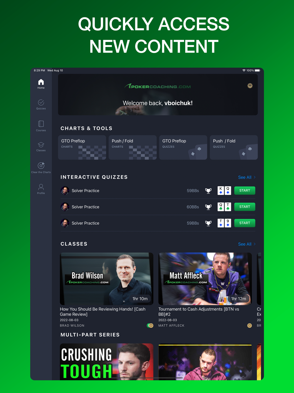 Master the game with Preflop GTO Charts, GTO Chart Trainer, Push/Fold Charts and Quizzes, Interactive Hand Quizzes, Video Classes, Webinars, Courses from top-level poker coaches with combined earnings of over $74 million.