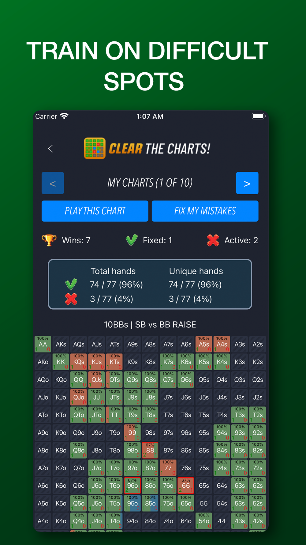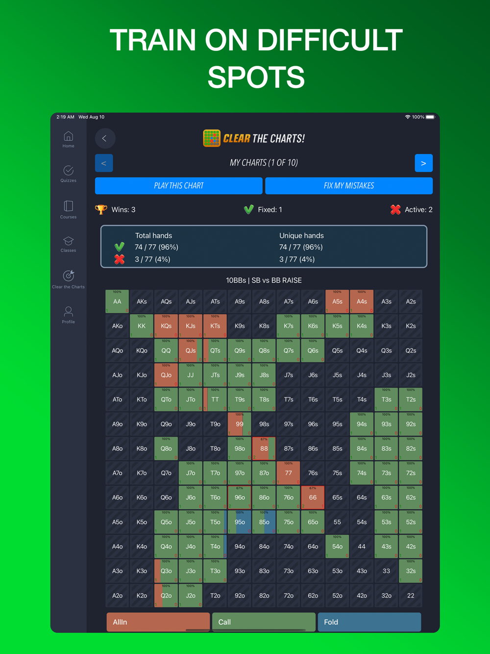 Clear the Charts is a GTO trainer that helps you memorize how to play every hand in your range from every position at every major stack size. With every chart you clear, you unlock a new chart! Learn GTO ranges while having fun!