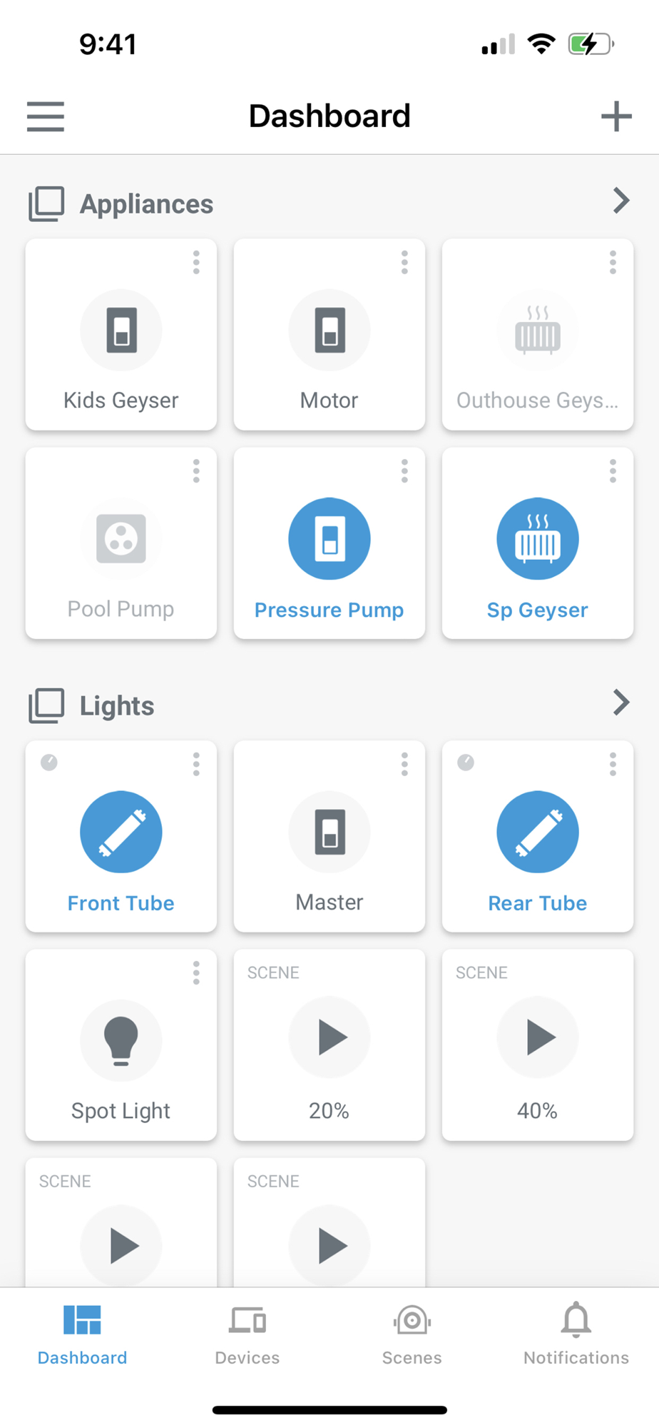 For ease of use, frequently used lights and switches can be grouped in the dashboard. Create scenes to run your custom settings on the switches and lights.