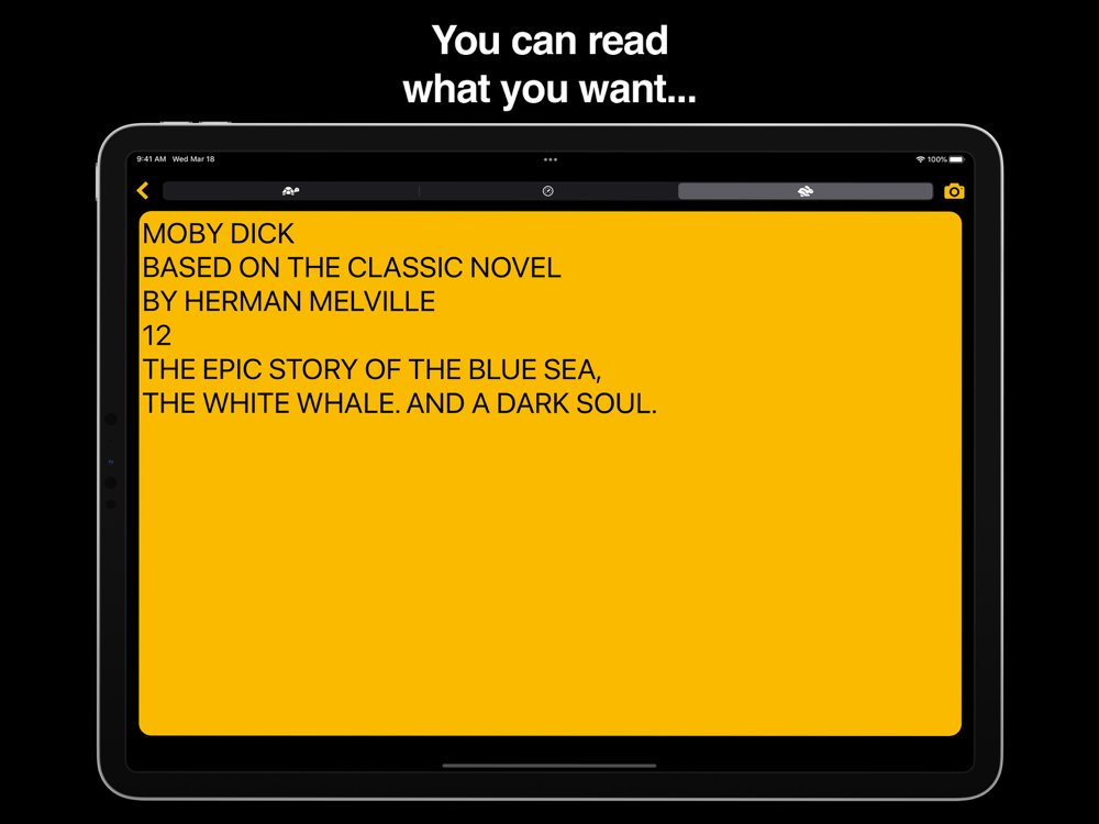 - Read: The app will read text in real-time from camera image, you can also take a photo, or chose one from the camera roll. Any text will be read for you.
