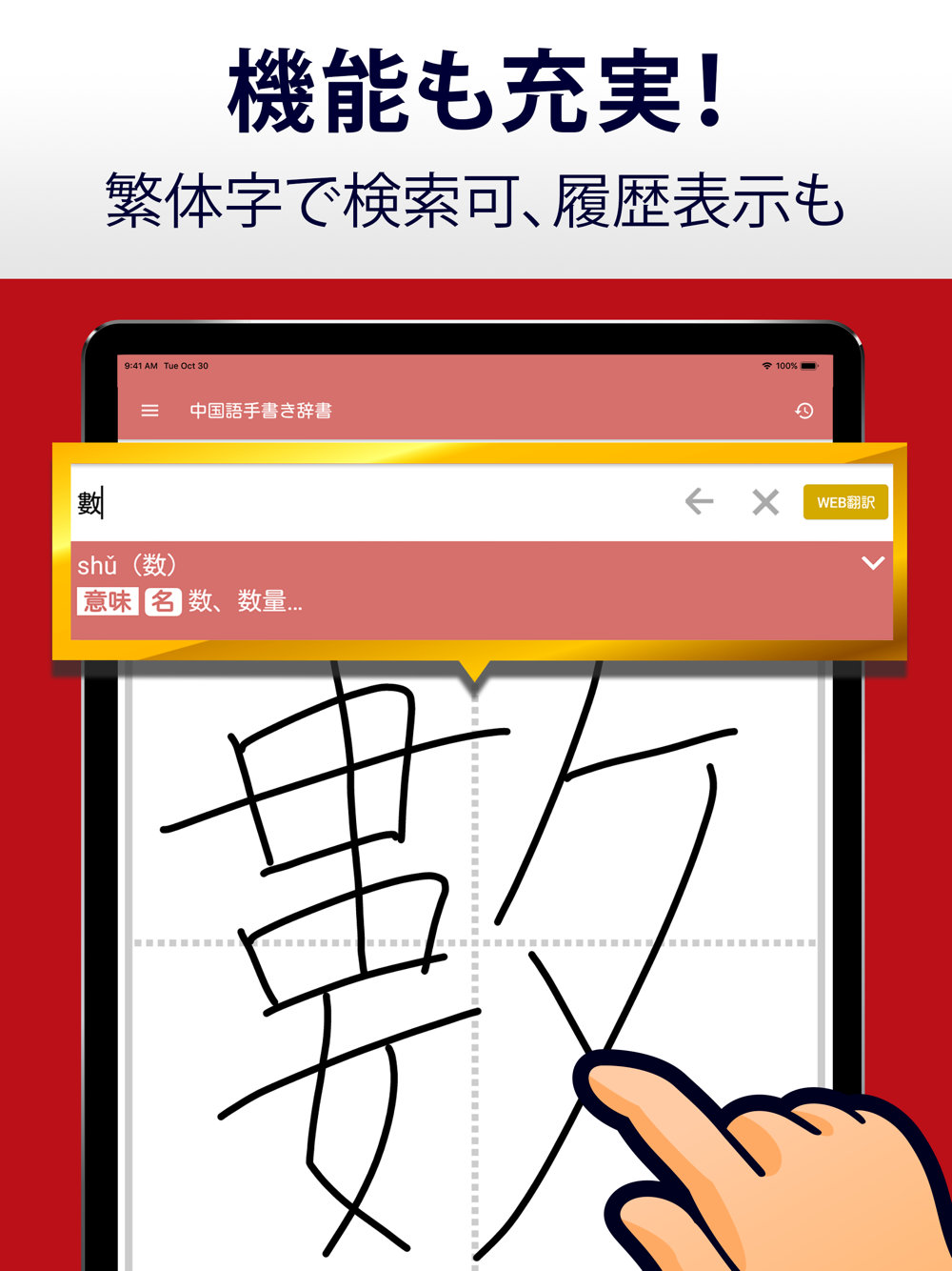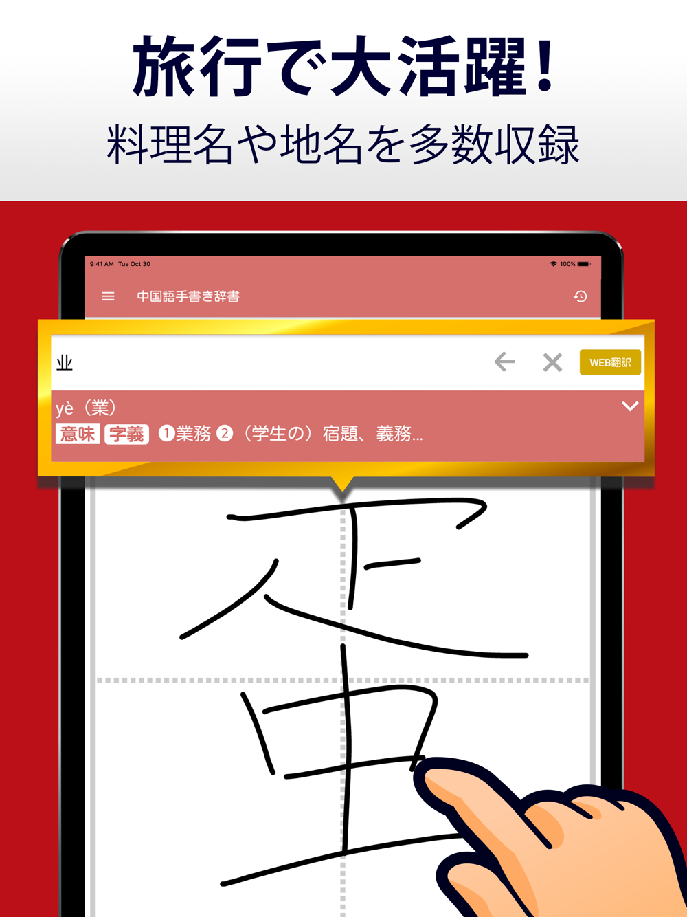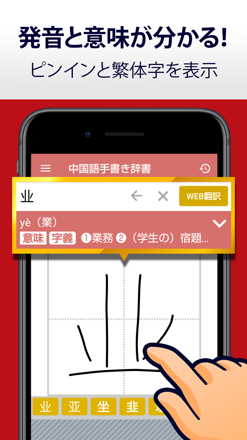 中国語(簡体字/繁体字)を手書きして、日本語での意味やピンインを調べることができます。