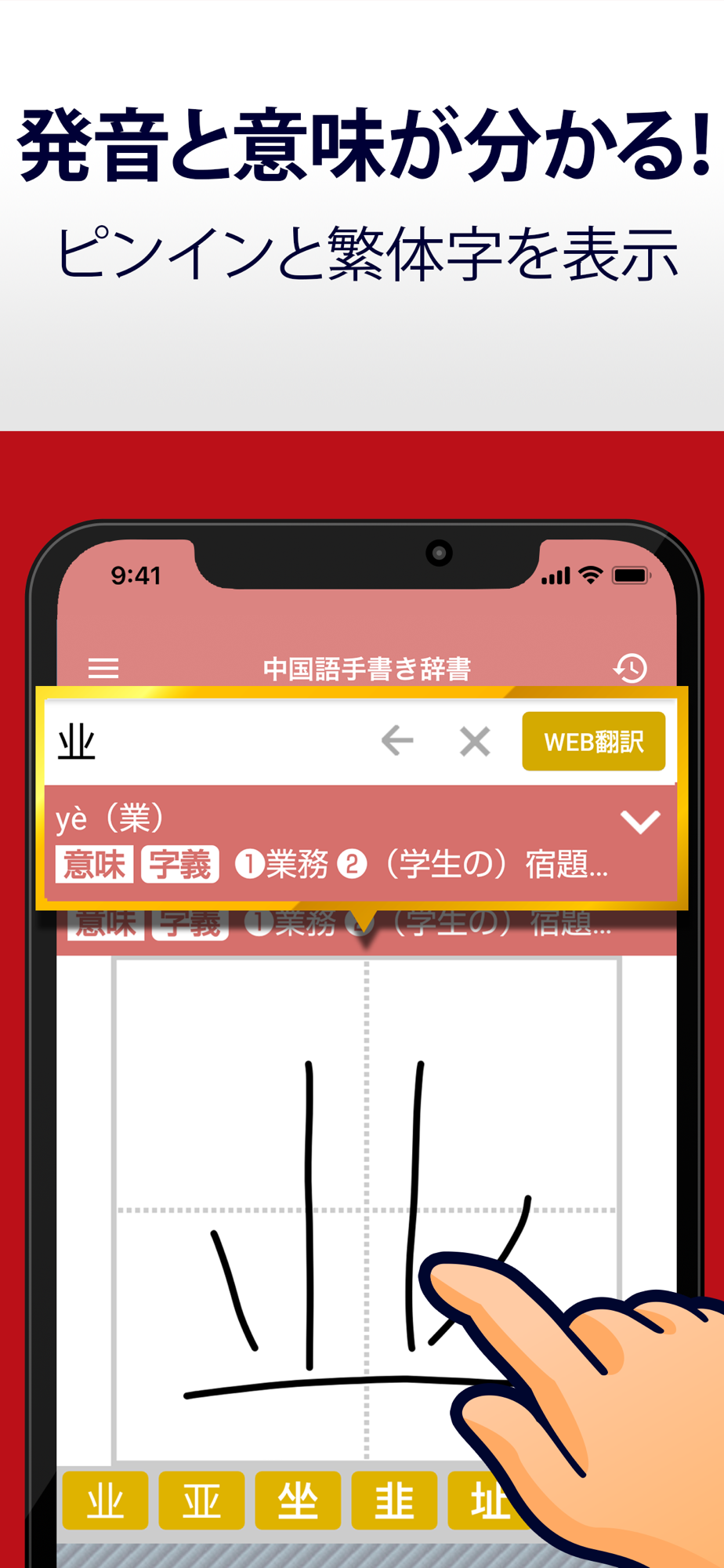 たくさんの応援レビューを頂き誠にありがとうございます!開発の励みになります!・1文字目を手書きした後、その漢字を含む熟語とその意味を一覧表示できるようになりました・一部の広告の表示方法を改善しました・いくつかのピンインを修正しました・その他、細かな点を改善しましたこれからも、本アプリ「中国語手書き辞書 - 中国語を日本語に翻訳する中日辞典」をぜひご活用ください!