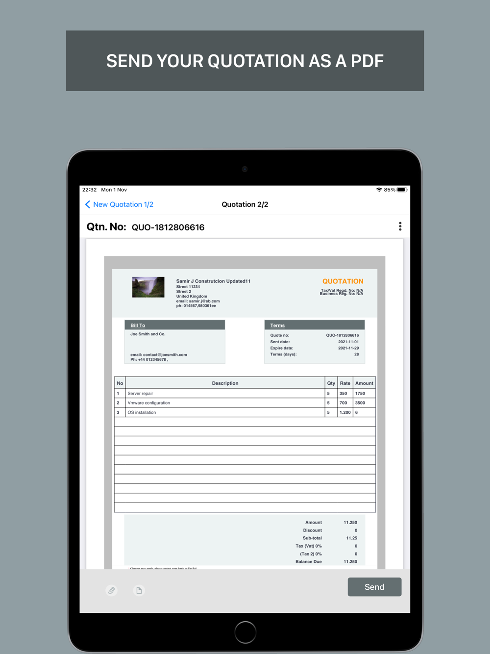 Quotation Book is a simple cloud-based mobile app designed to create and send quotations. We have kept our app free* to use, helping small businesses grow. Create professional estimates/quotations quickly and manage your business from anywhere. Securely store your contacts and documents so you have unlimited access to version history. Designed by a team of system analysts and accountants with in-depth knowledge of small business, the app meets all your day-to-day needs and ensures compliance with digital xxx.