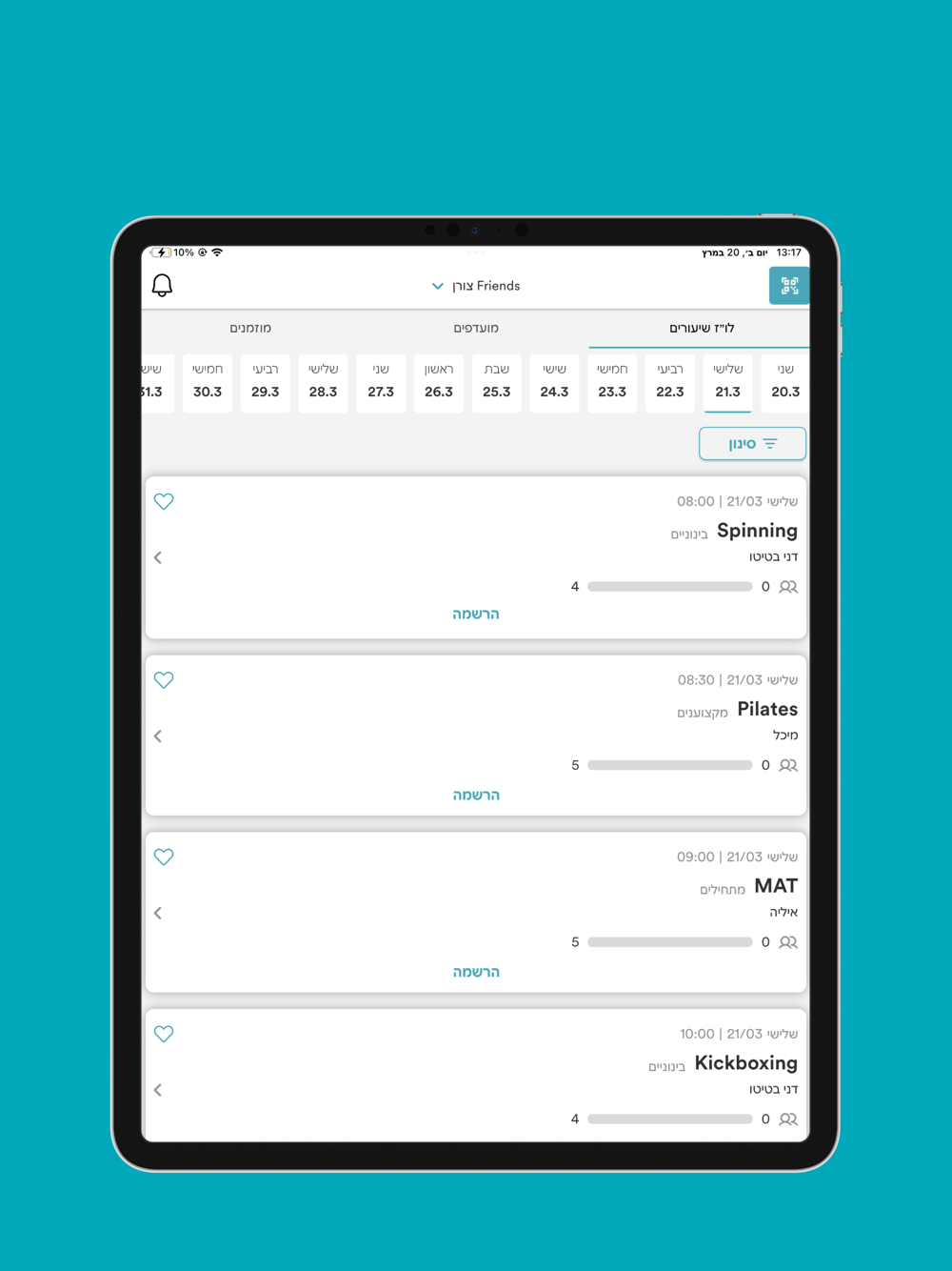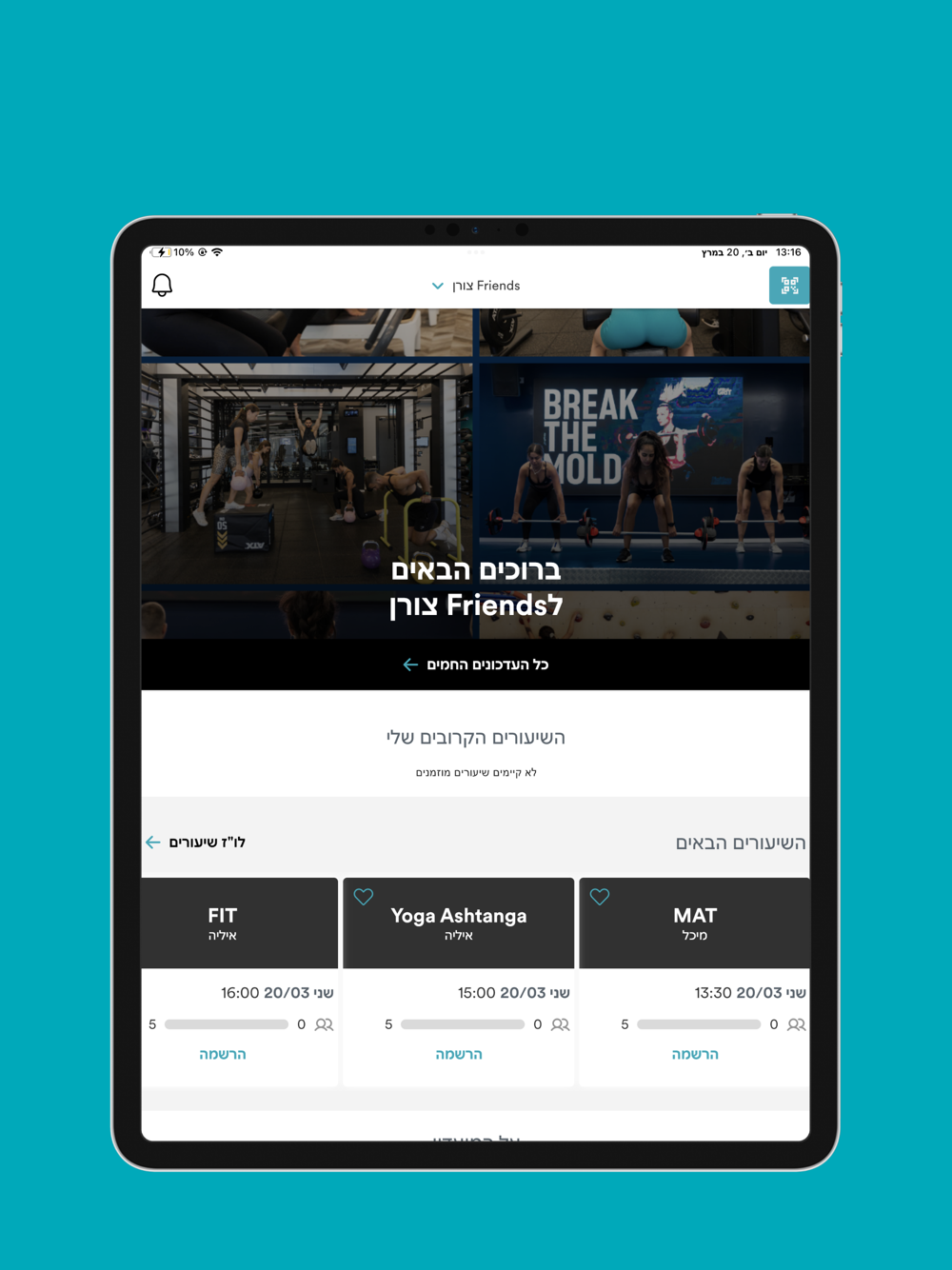 הצגת מערכת השעות, רישום לשיעורים ובחירת מקומות מראש לשיעורי הסטודיו, אופניים, שיעורים וירטואליים ועוד.