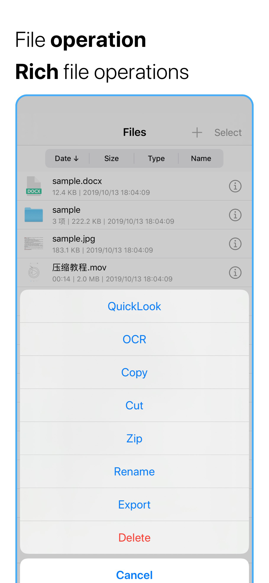 - APP can directly extract and manage files in iCloud Drive and Dropbox, and can compress or export photos, videos and iPod media files in mobile phone albums.