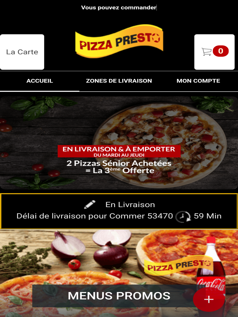 L'application Iphone/Ipad de Pizza Presto vous permet de commander en ligne ou par téléphone via votre application. Vous pouvez consulter notre carte et choisir vos produits.