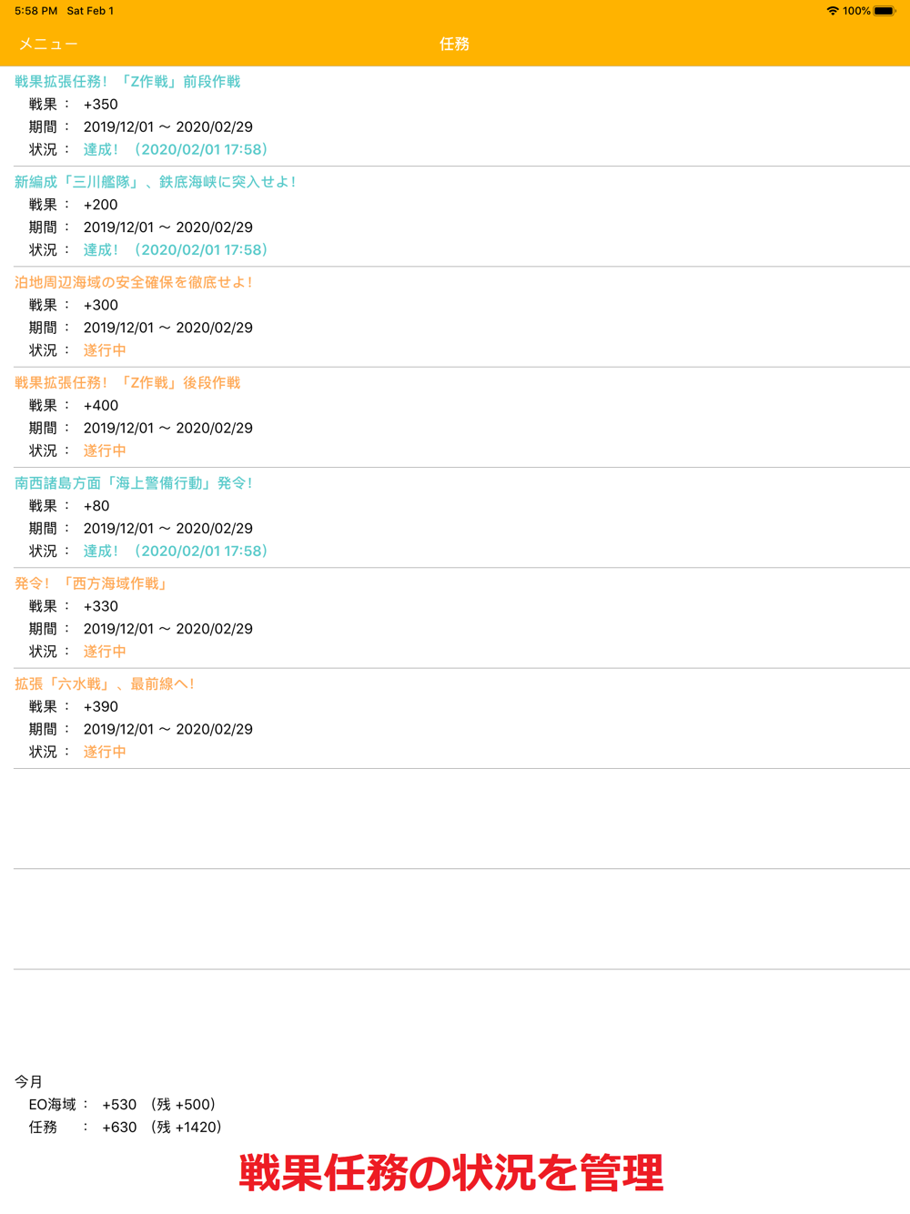 ・戦果任務のクリア状況や獲得できる戦果が分かります。