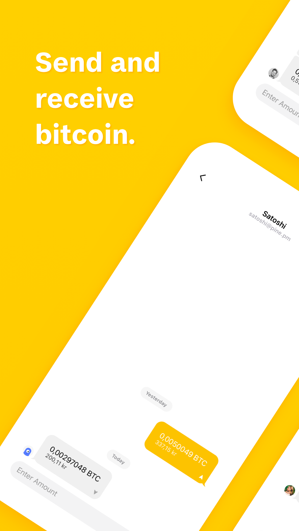 Pine is a bitcoin app for sending and receiving money among your friends and family. It looks like a messaging app but instead of sending messages you are sending bitcoin.
