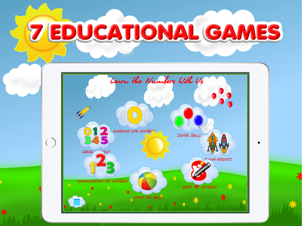This game is for finding the studied numbers in game form. Balls with numbers appear on the screen and the task is given - a number that is pronounced and written in the middle of the screen in the sun. The child needs to find the required number on the ball and click on it, the ball will burst. The task is considered completed after the 7 balls have burst. After this task the number changes and new balls with mixed numbers are given. Every time the numbers change randomly.