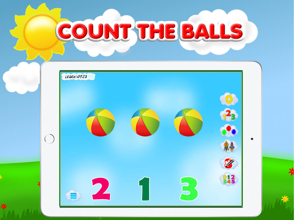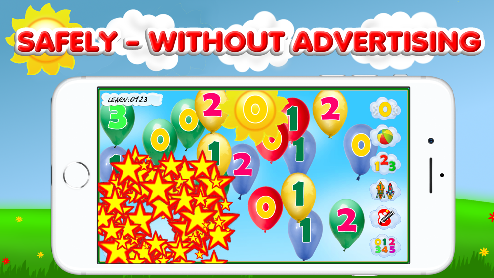 The screen is a sky where the rockets are launched with the numbers on them. A task is given - to find a number that is pronounced and written in the sun. The numbers with the rockets fly constantly upwards and the kids needs to have time to find the required number on the rocket and press the rocket.