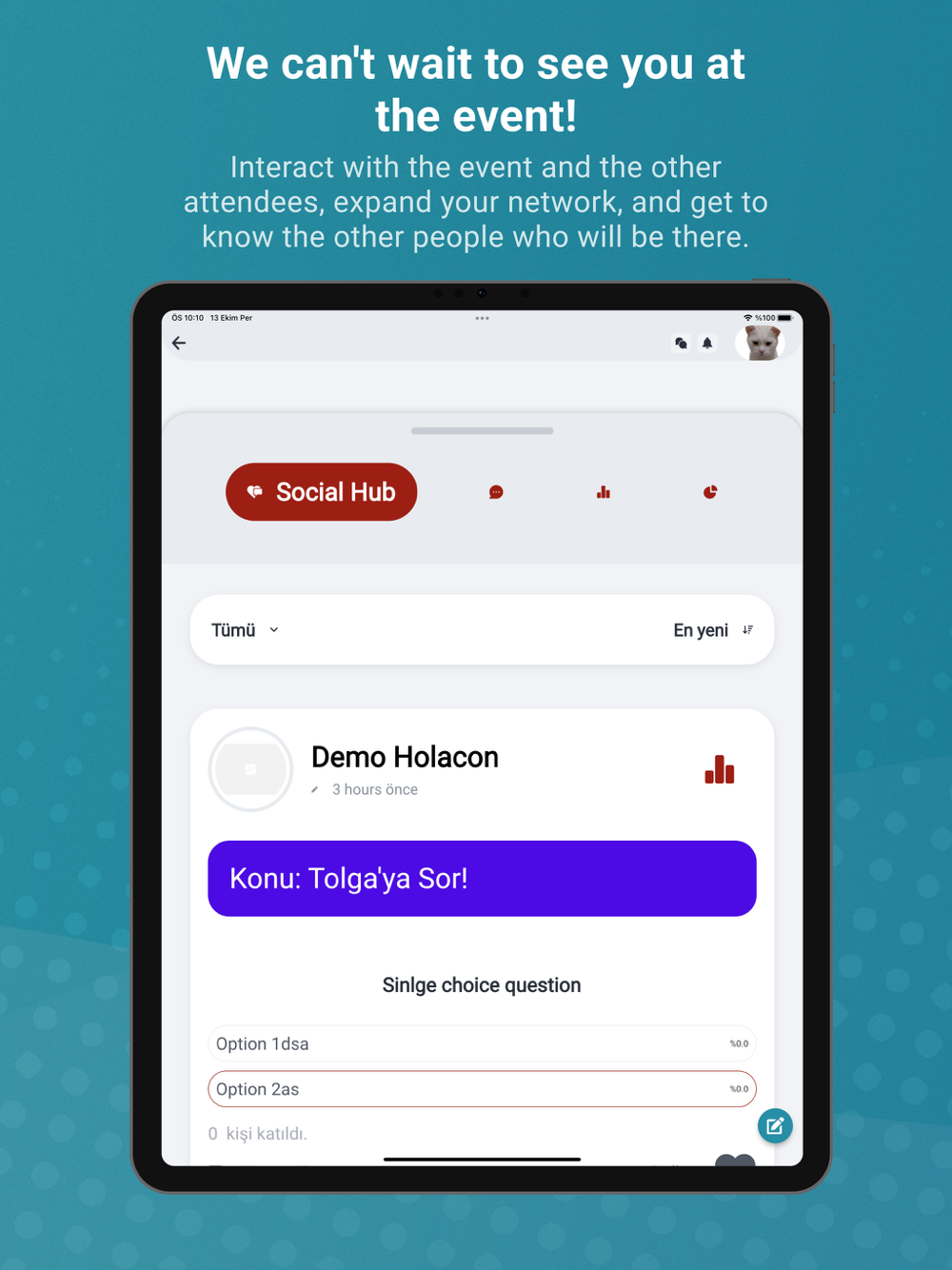 Holacon is an interactive event application developed with the aim of providing interactivity, increasing interaction and expanding the networks of the participants in virtual, hybrid or onsite events.