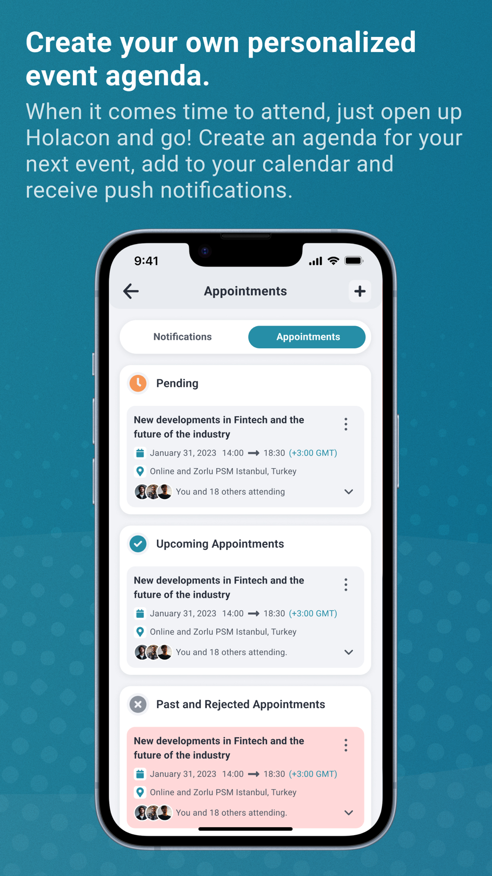 When it comes time to attend, just open up Holacon and go! Create an agenda for your next event, add to your calendar and receive push notifications