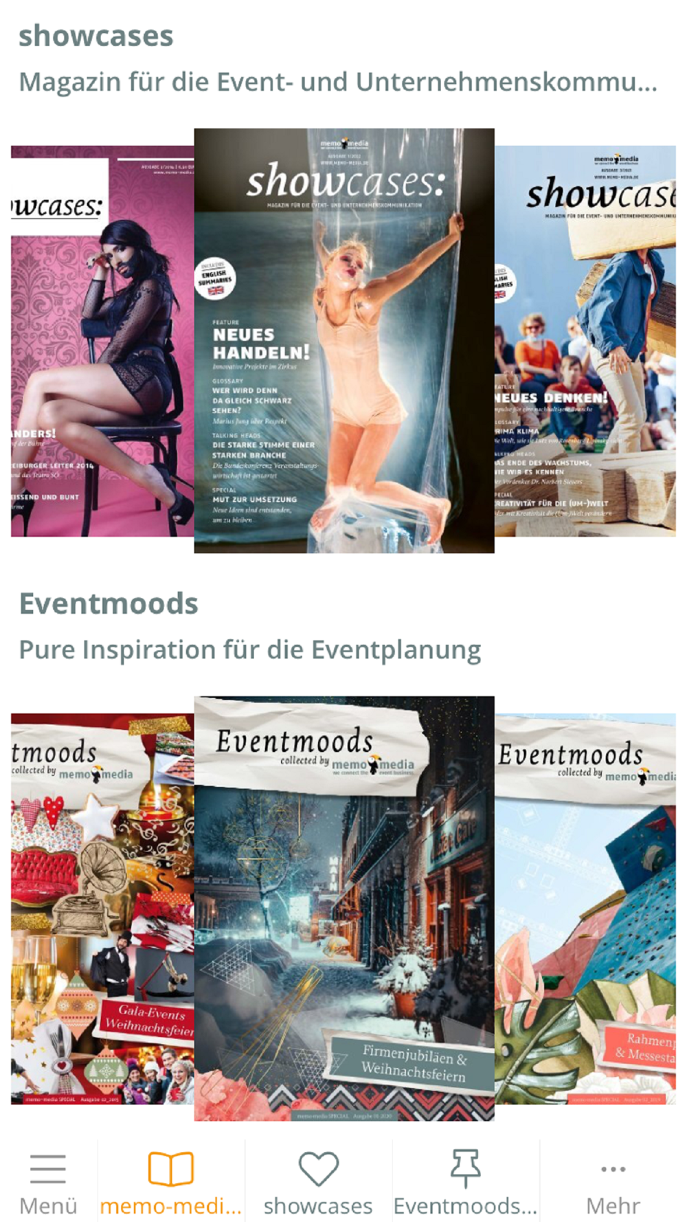 Die memo-media Library App bietet Ihnen die showcases Magazine als eMags und das Eventbranchenbuch memo-media als eBook. Stöbern Sie in den Publikationen rund um das Thema Eventkonzeption und Veranstaltungsorganisation und informieren Sie sich über Eventtrends, außergewöhnliche Artisten und andere Künstler und innovative Veranstaltungstechnik.