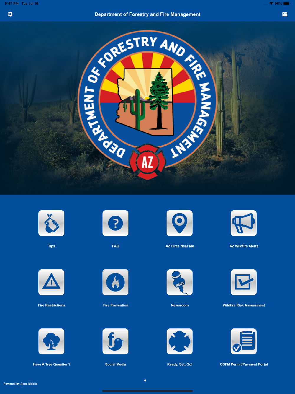 Welcome to the iOS app for the Arizona Department of Forestry and Fire Management. The Arizona Department of Forestry and Fire Management app allows users to report issues or concerns directly from your iOS device with photos! There are useful links for community resources, fire prevention, and on-line reporting!