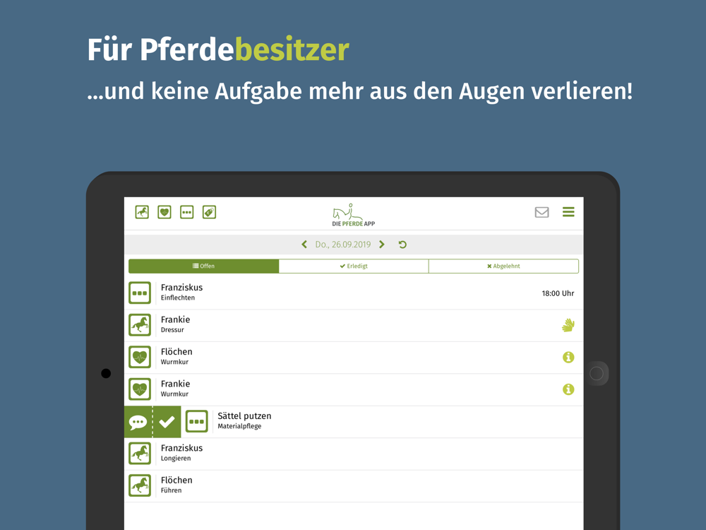Ob Impf-, Schmied- oder Wurmkurtermin für Ihr Pferd – mit der App haben Sie immer alles dabei. Stimmen Sie sich mit Ihrer Reitbeteiligung oder Ihrem Stallbetreiber über die täglichen Aufgaben zu ihrem Pferd ab.