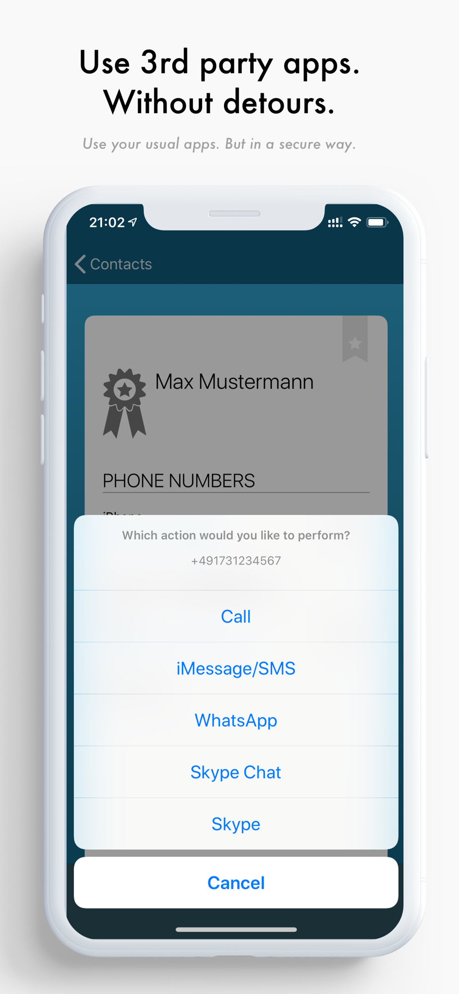 SecureContact X is not only the secure safe for your contacts - it never gets in the way of your work. With the privacy-friendly connection to third party messengers, e-mail and VoIP / SIP clients you can continue to use your contacts for daily communication. You simply start the communication from any of your contacts in SecureContact X. Full privacy at full productivity!