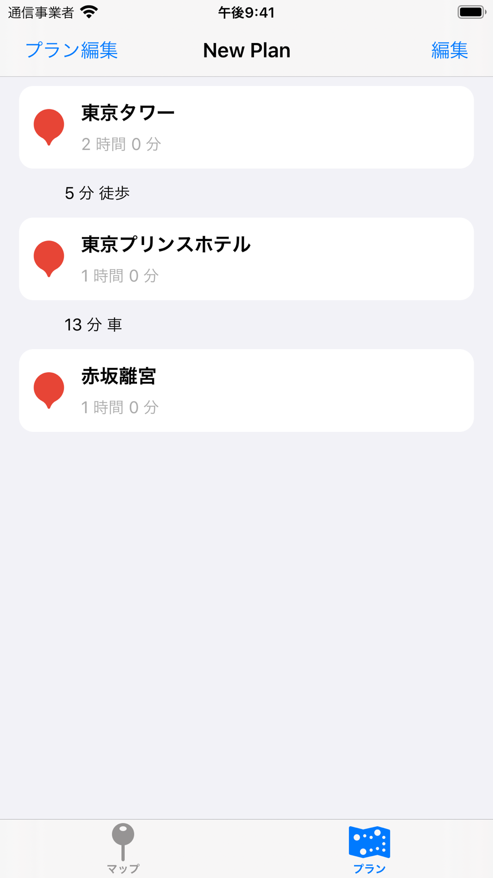 地名・施設名を検索して、旅行のプランを作成するアプリです。