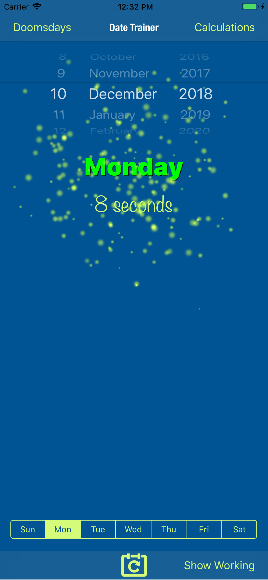 Based on the Doomsday Algorithm developed by the great Professor John Conway, Date Trainer allows you to hone your skills as you wow your friends by successfully naming the day of the week for any date from 1800 to 2200.