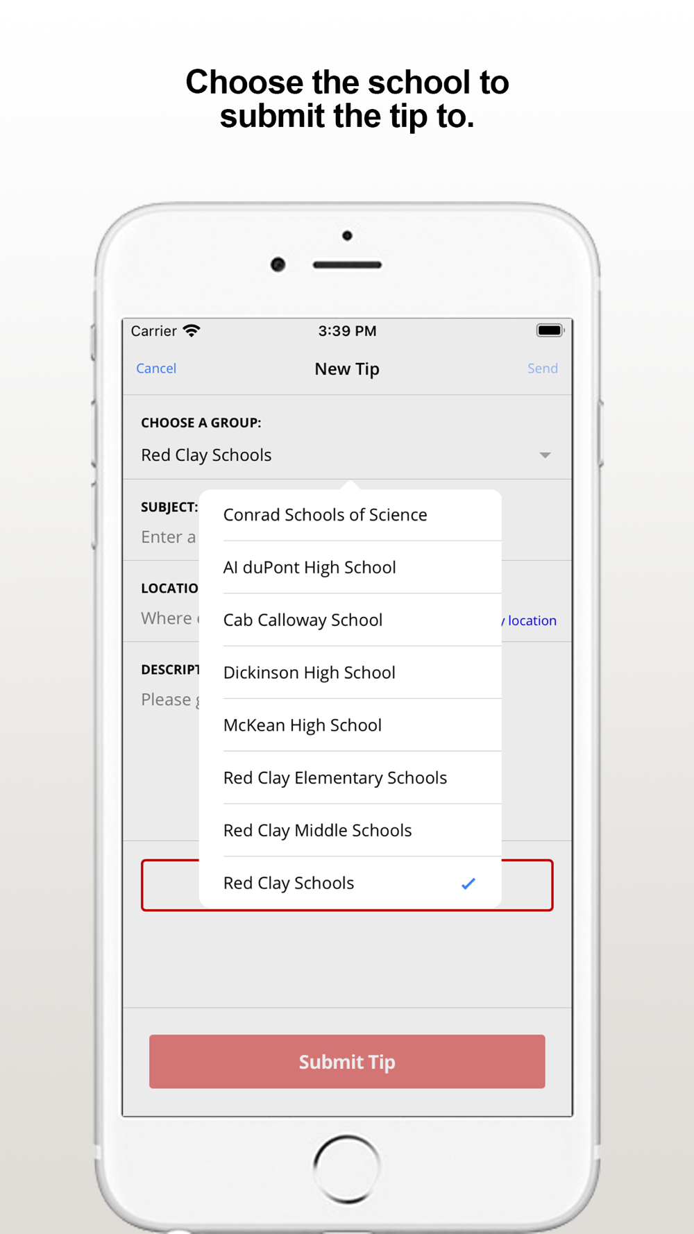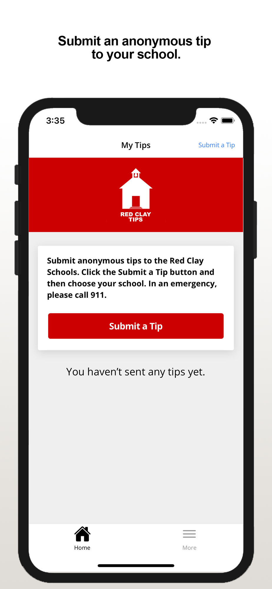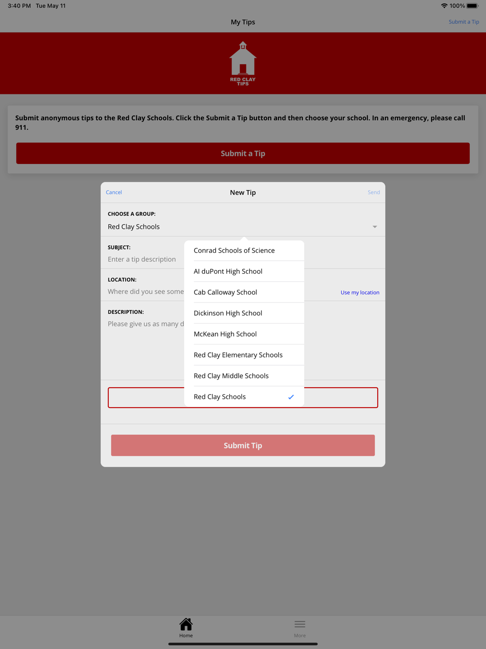 The Red Clay Tips app provides citizens the ability to submit anonymous tips to the Red Clay, DE Consolidated School District. The app also displays organization web and social media content.