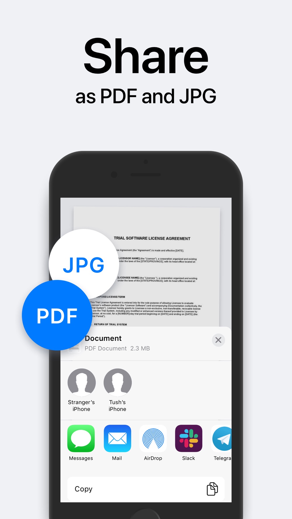 * Share scans separately or send a number of files in one PDF file via Mail, iMessage or save to Photos
