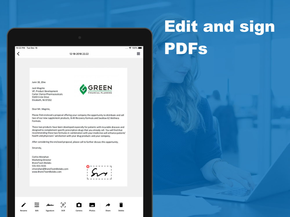 Turn your device into a portable scanner. Scan, print and manage documents with your iPhone or iPad with ease. You can scan: contracts for your clients or partners, receipts for tracking your expenses, business cards, articles and book pages - just about anything!