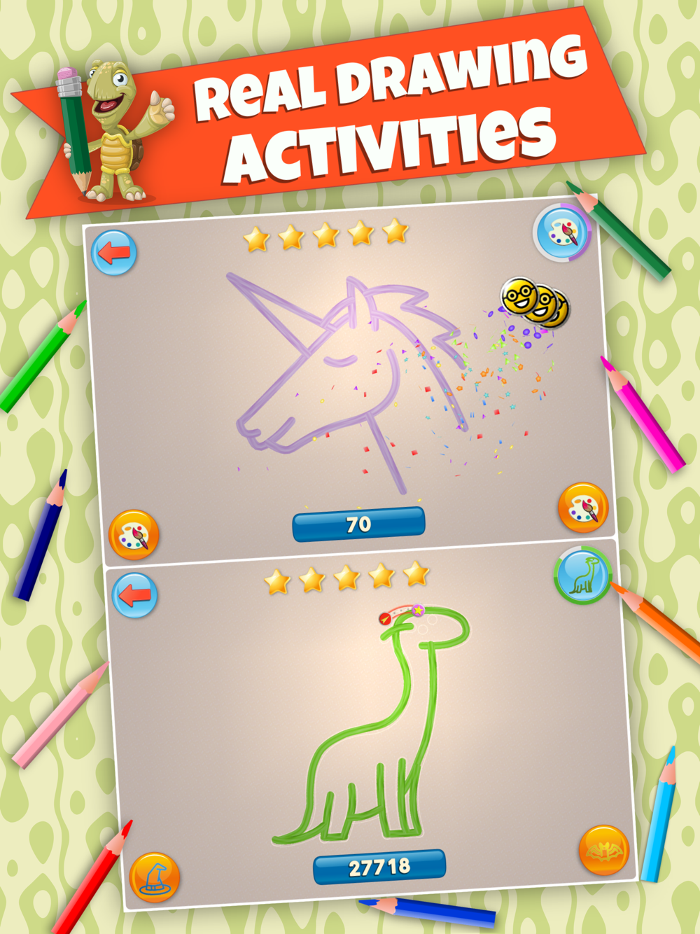 • 5 progression levels, color coded for each draw that allows parents and teachers an instant evaluation of the progression and most exercised drawings.