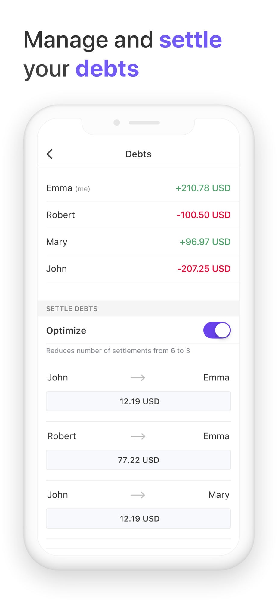 Just input bill details and Spend Together will do all the dirty work for you. It will calculate group debts and suggest optimal payments to settle them up.
