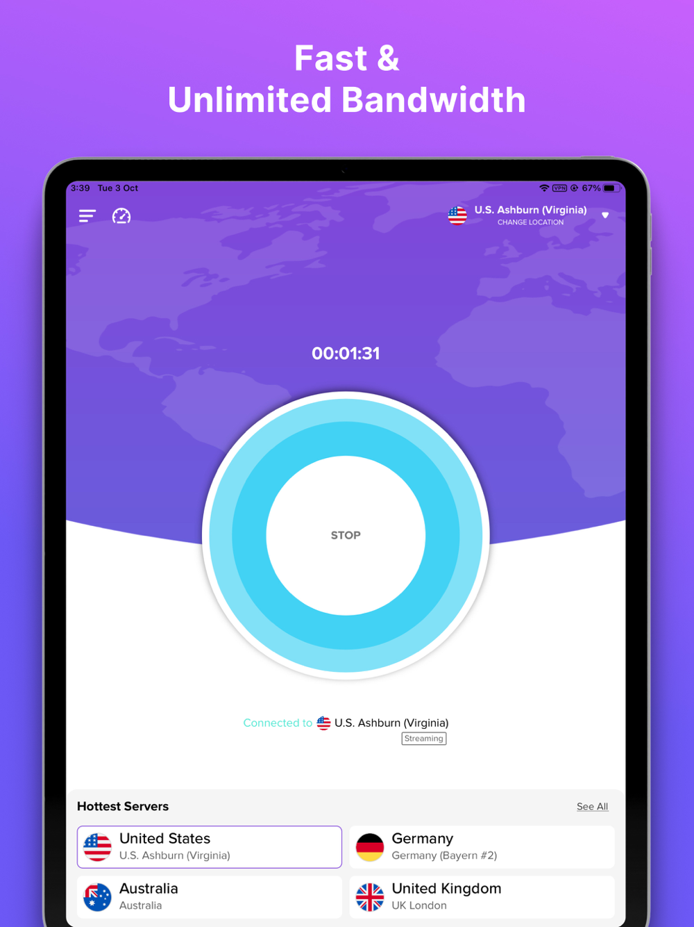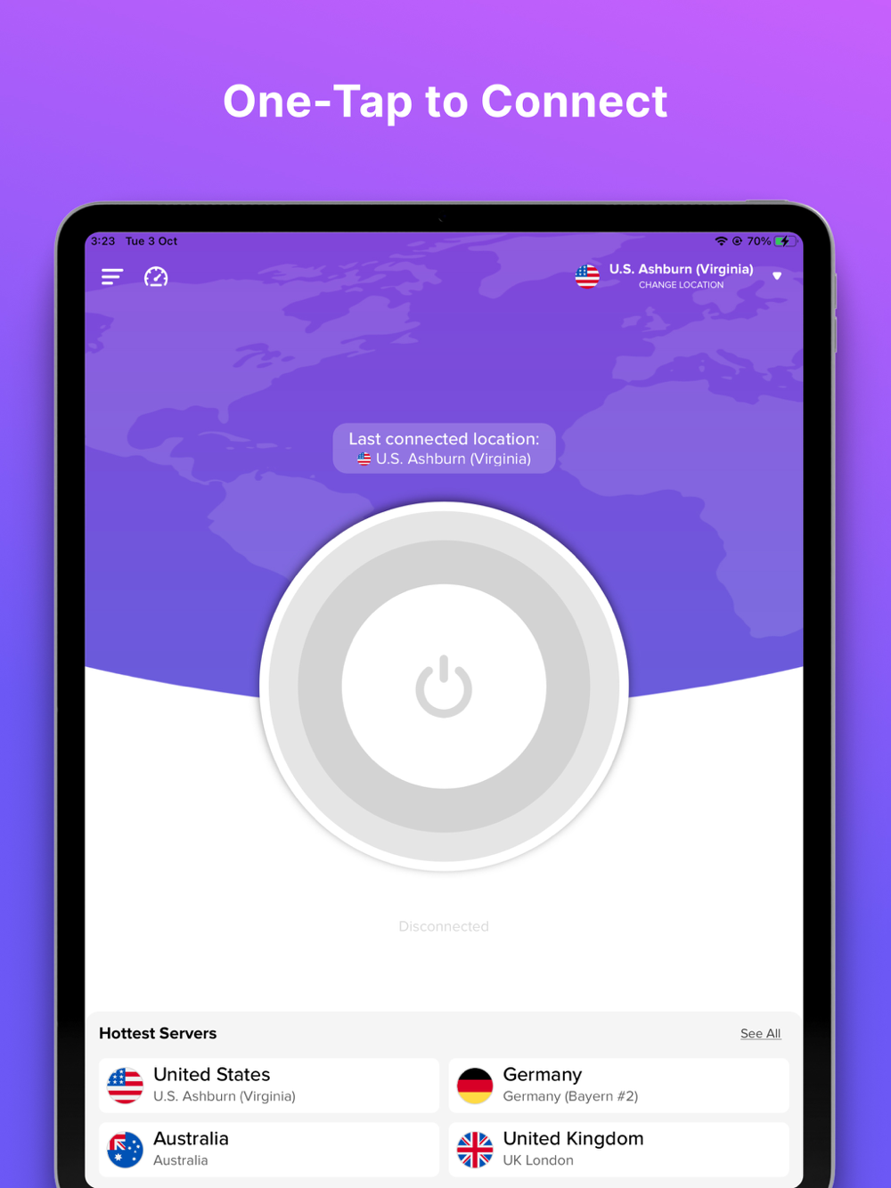 • Very easy UX and UI – just a tap to connect to the closest server!