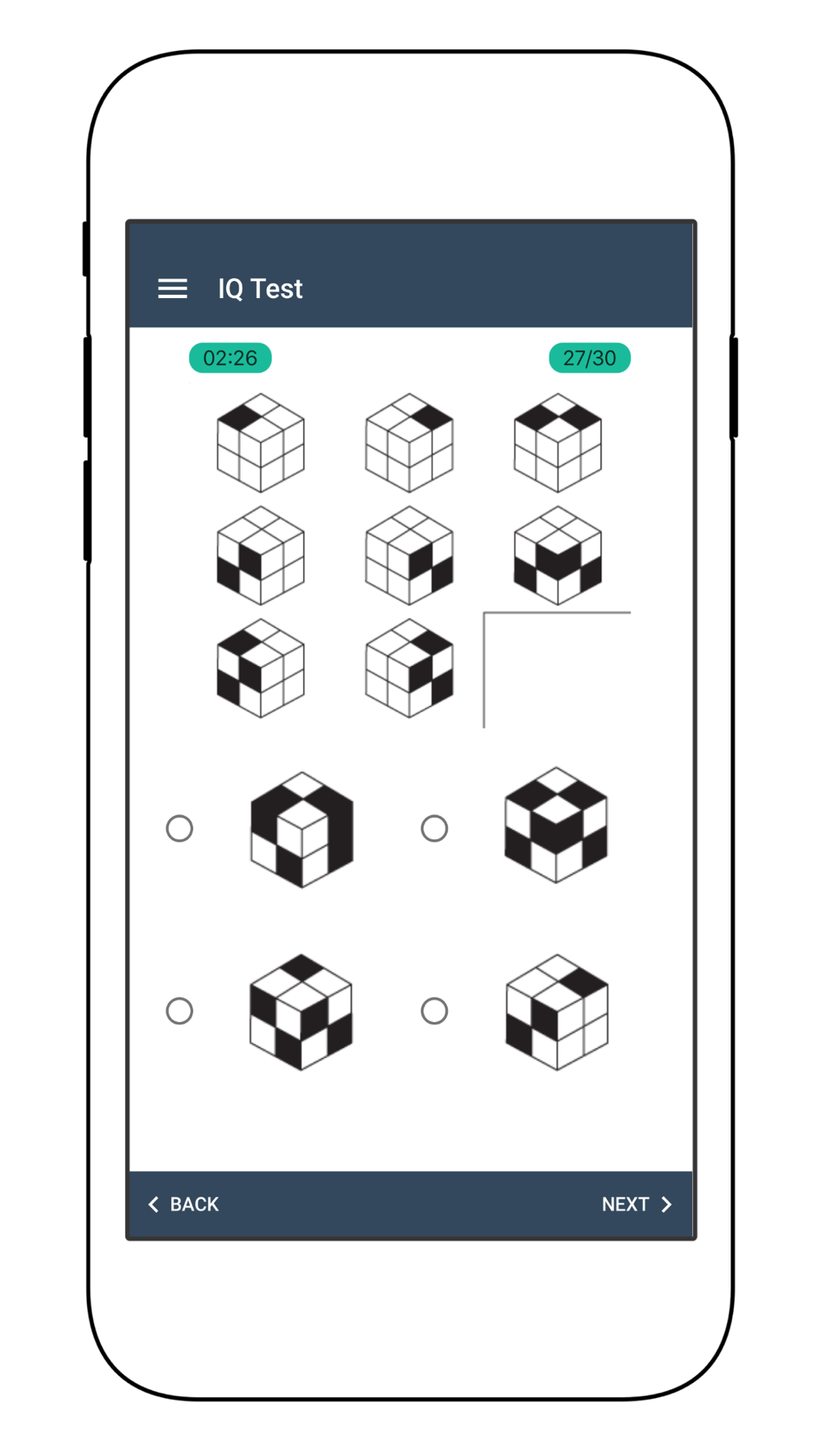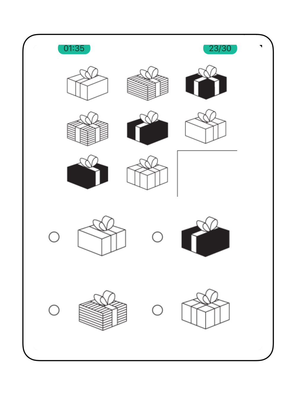 1) IQ test that is similar to Ravens Progressive Matrices with fun and straightforward question types. There will be 30 of these questions with 4 different answer choices.