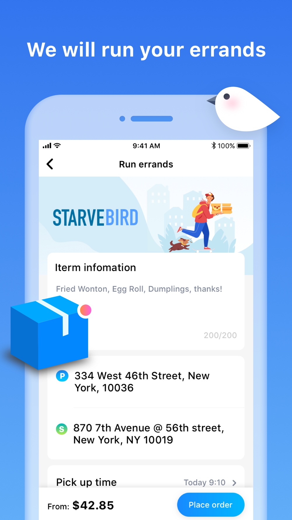 Starve Bird is a one-stop service platform that provides high quality food delivery, errands service and advertising /marketing services. Our mission is “One App, does it all”; Our company aims to establish a multi-functional platform by providing more services to satisfy our customer’s needs. With a few simple taps in the app, you can relax while we take care of your food from your favorite restaurants to your door.