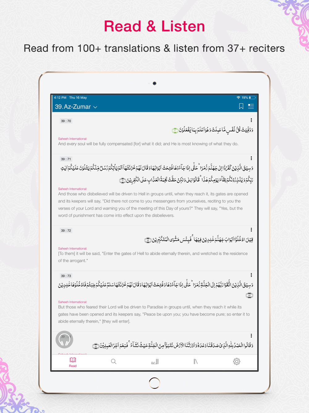 Read the Holy Quran in Arabic alongside multiple translations at the same time.