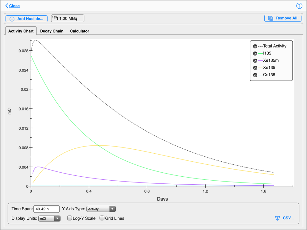 InterSpec also provides a number of other tools useful for analyzing radiation data including spectral file format converting, dose rate calculations, interactive nuclide decay and reference information, gamma cross section calculations and references, and more.