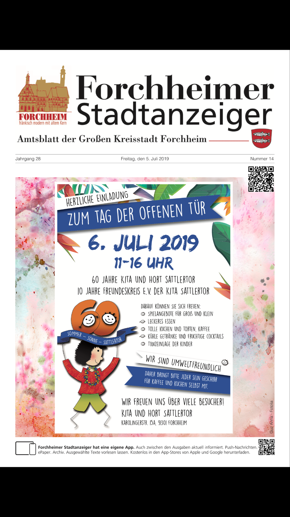 Mit der App vom Forchheimer Stadtanzeiger können Sie aktuelle und vergangene Ausgaben als ePaper lesen. Sie können auf den einzelnen Seiten hinein und hinaus zoomen. Einmal heruntergeladen, stehen Ihnen die einzelnen Ausgaben auch ohne Internetverbindung zur Verfügung.