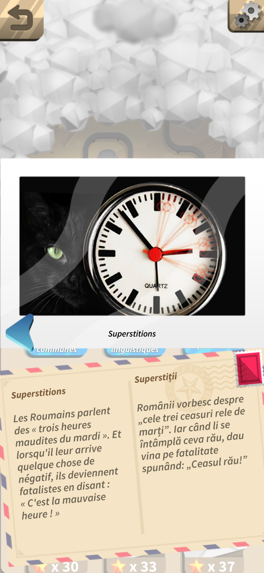 Au cours de votre progression, vous débloquerez des informations culturelles précieuses pour poursuivre votre quête dans Romanica, ainsi que des badges récompensant vos talents de polyglotte en langues romanes.