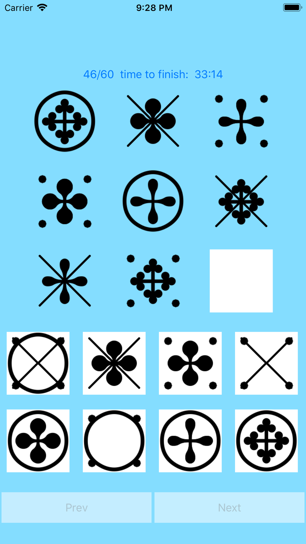 The Raven IQ test includes sixty questions. The application has three options - a full intelligence test consisting of 60 questions, a moderate IQ test with 30 questions and a quick test, which is shortened to 15 questions.