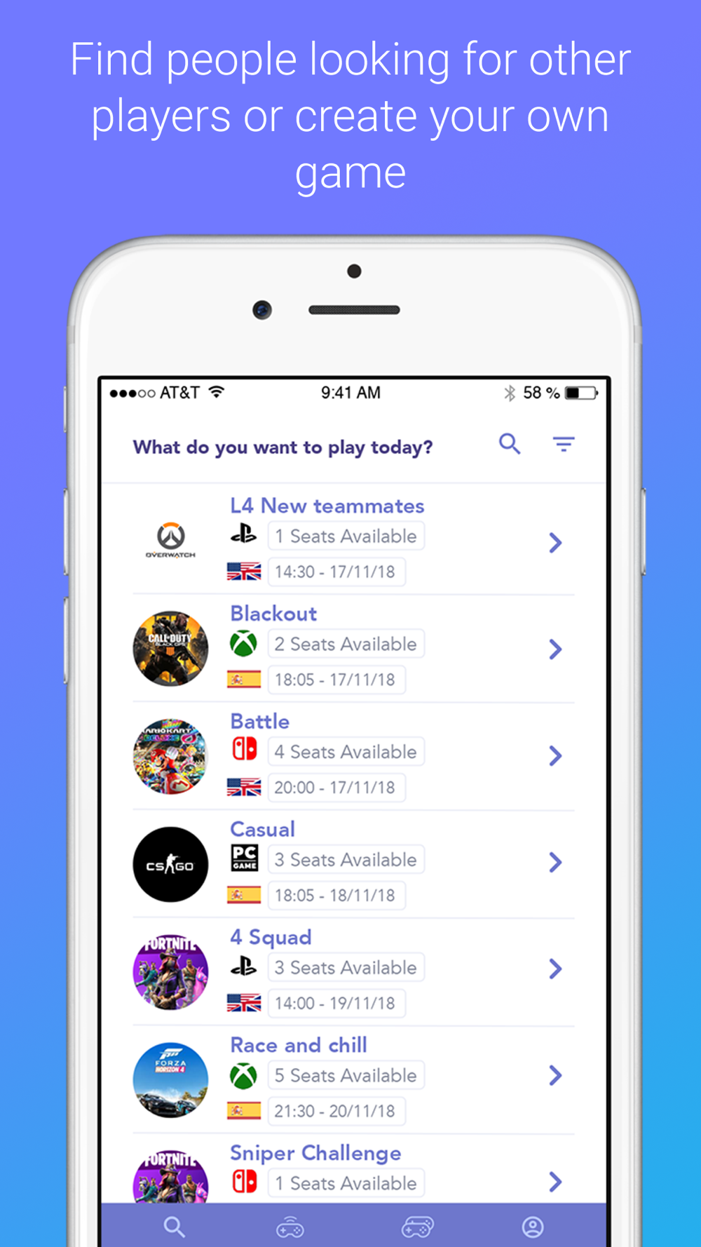 Gevent helps you find people to play with at any game on any platform, whether you are looking for 3 people for a Fortnite squad or someone to play against at Rocket League, just join an active event or create a new one.